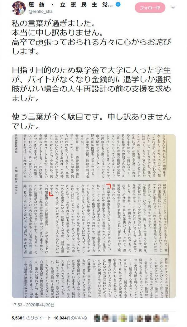 蓮舫議員 高卒で頑張っておられる方々に心からお詫びします 予算委員会での発言をtwitterで謝罪 2020年5月1日 エキサイトニュース
